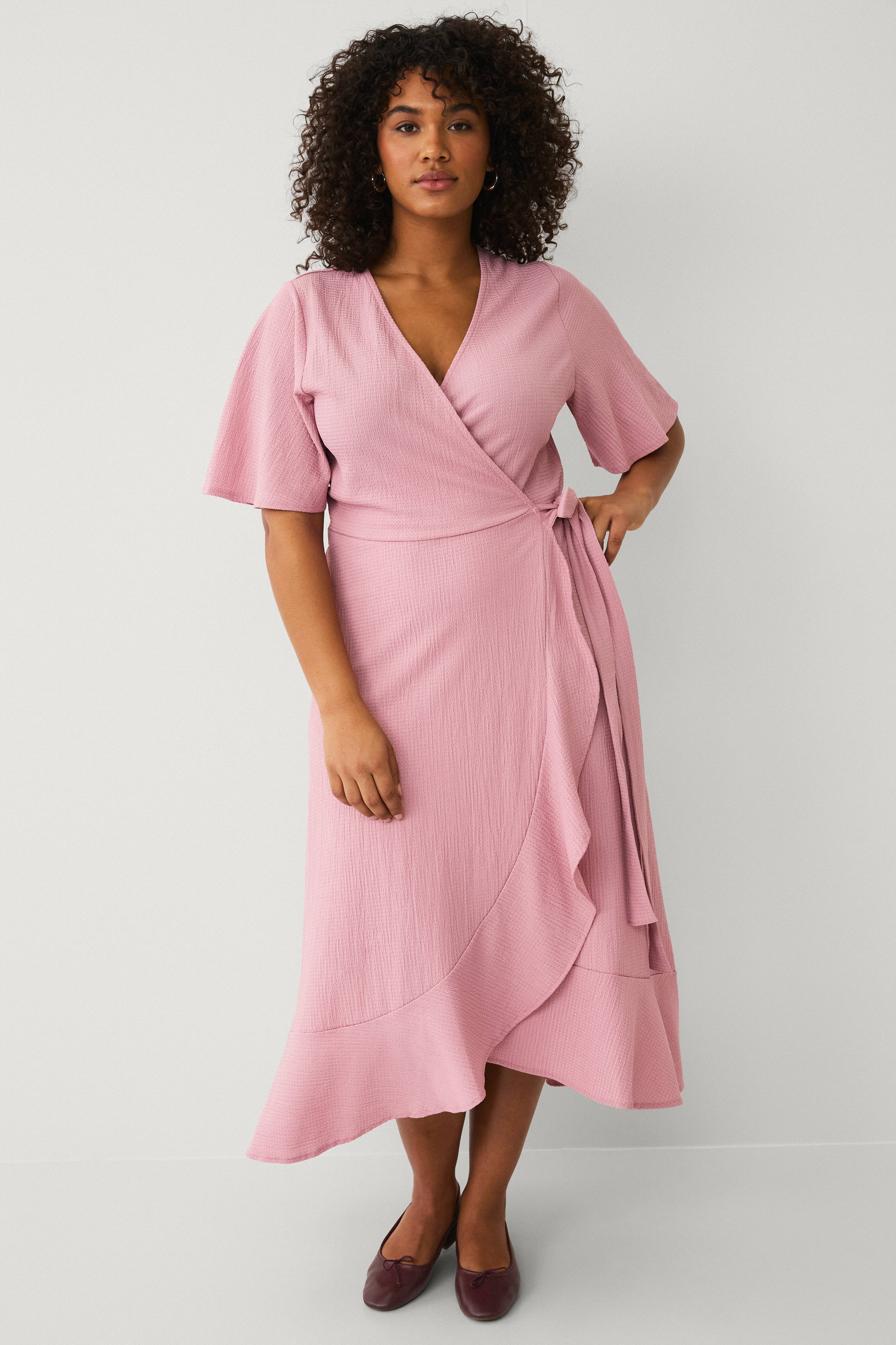 • Stof met structuur met lichte stretch • Overslagdesign met striklint in de zijkant en diagonale ruche aan de voorzijde • Korte mouwen • Ruche bij de onderste zoom • Lengte: 134 cm in maat 42/44